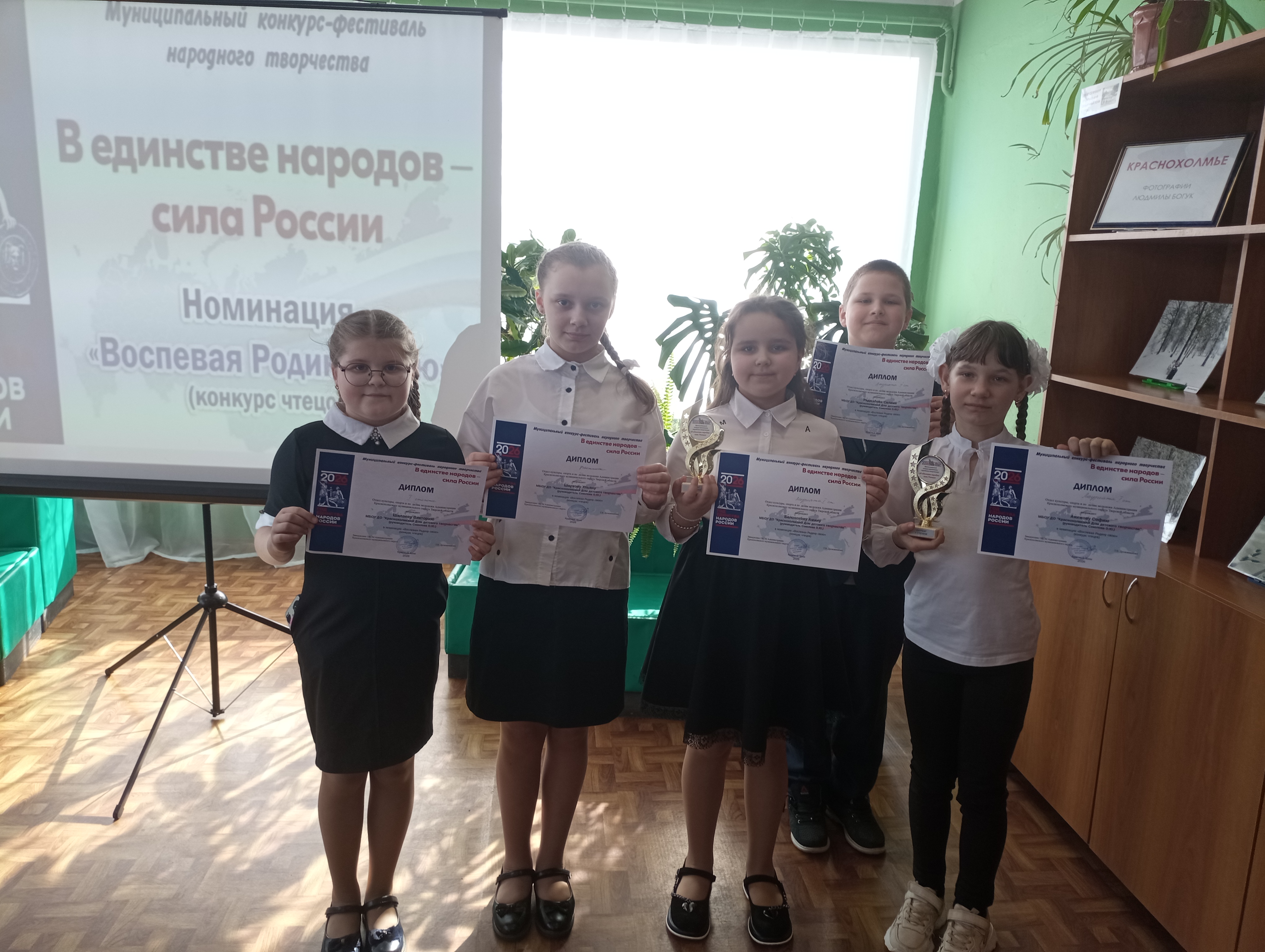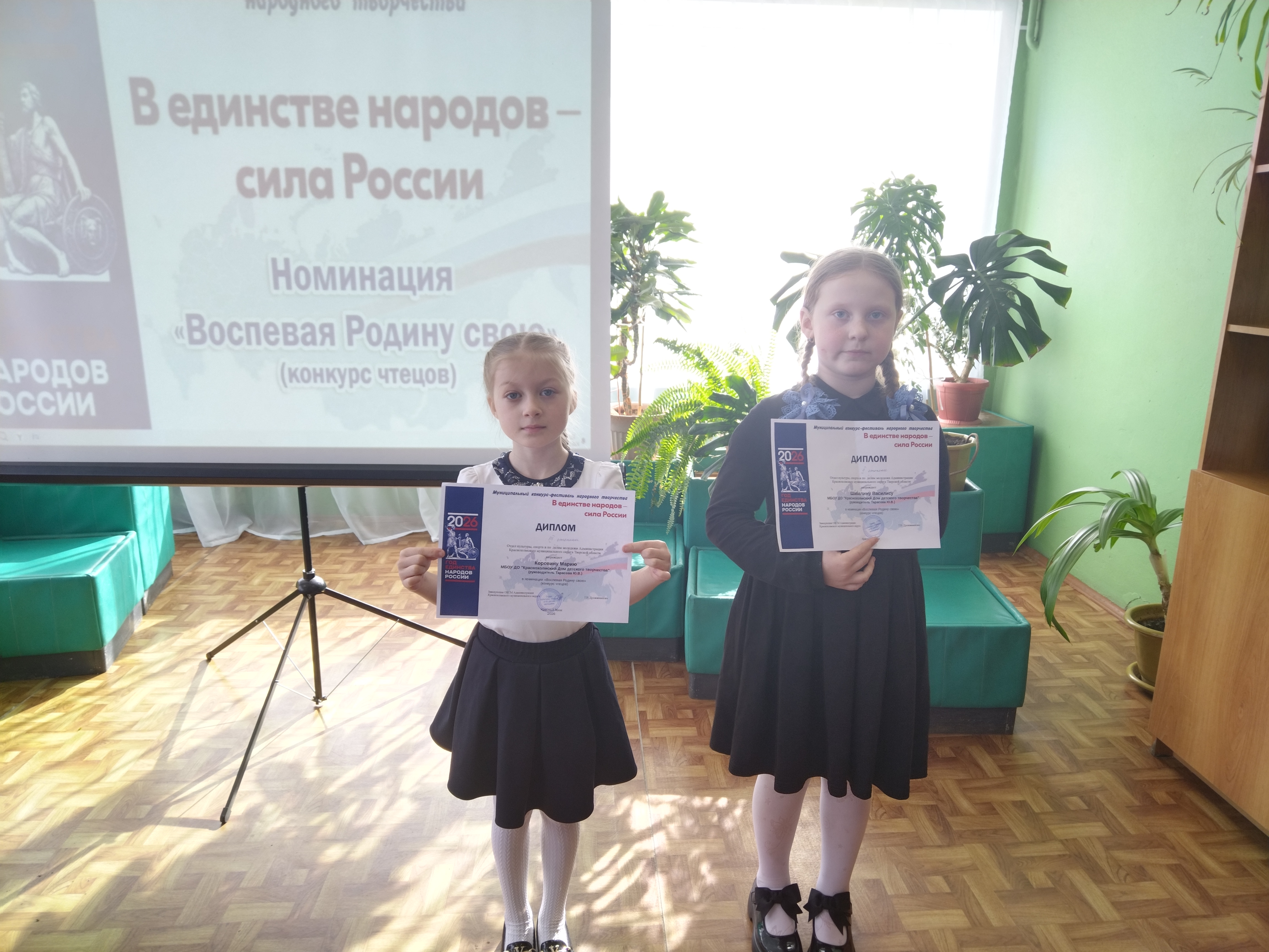27 марта в читательском зале Центральной библиотеки прошёл II этап Муниципального конкурса – фестиваля народного творчества «В единстве народов – сила России» по номинации «Воспевая Родину свою» (конкурс чтецов), от нашего Дома детского творчества приняли участие воспитанники театральной студии «Чародеи» и вокально – хоровой студии «Звонкие голоса». Дети наизусть читали стихи о Родине, воспевающие единство и дружбу народов России. За своё старание, выразительное чтение все награждены дипломами: