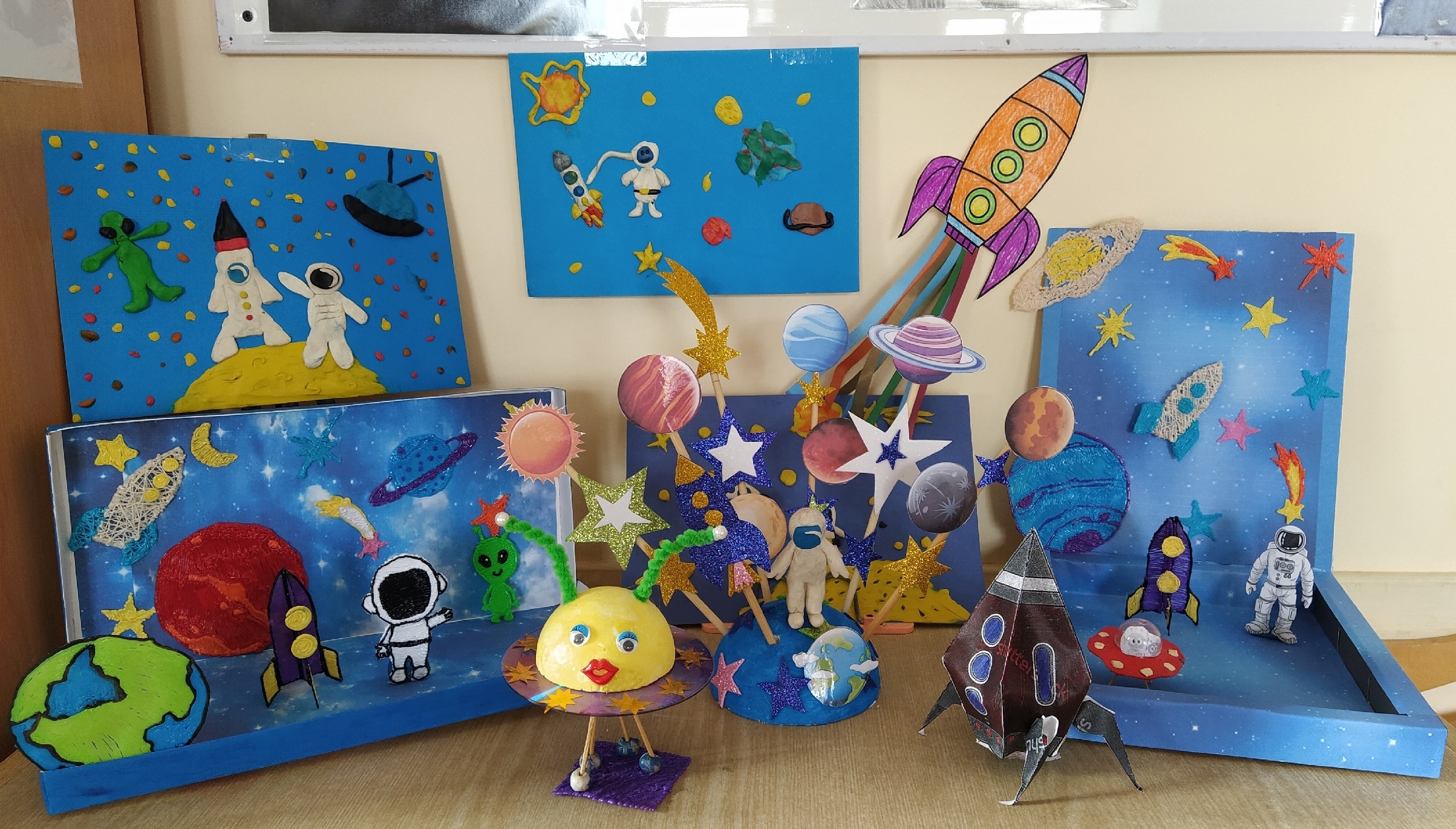 Так, в художественных студиях «Мастерилка» и «Волшебный мир 3Д ручкой» прошли тематические занятия по декоративно – прикладному творчеству (аппликация) «Поехали!», а воспитанники студии «Юный Художник» приняли участие в выставке рисунков «Бесконечная вселенная». Ребята рисовали планеты, вселенную, и конечно, первого в мире космонавта Юрия Гагарина, с помощью 3Д ручки изготовили модели нашей планеты Земля. У детей получились интересные, яркие рисунки и композиции. Так же воспитанники театральной студии «Чародеи» продемонстрировали своим сверстникам постановку на тему «Космос».